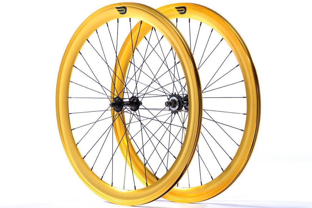 Pure Fix double-walled aluminum wheelsets are size 700C with a 40mm rim depth, front and rear. Our wheels include name-brand and laser-etched KT Quando hubs (100mm front, 120mm rear, 3/8" axle). Our rear wheels include flip-flop hubs with a pre-attached 16T fixed cog along with a 16T freewheel cog for single-speed riding. Our front and rear wheels are 32 spokes each. All wheelsets include nylon rim-strips to protect against sharp edges and prevent tube puncture.